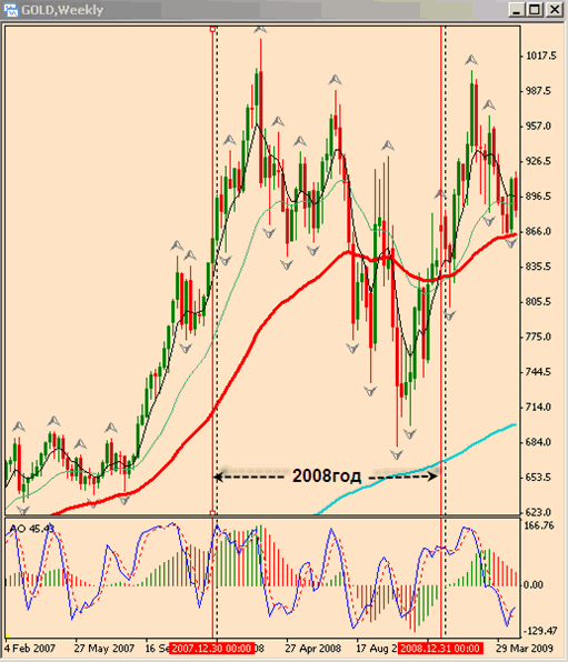 В сентябре, а затем и в ноябре 2009 года, когда Джордж Сорос, делал заявления об ожидании второй волны кризиса, а как известно во время кризиса происходит падение цен на металлы (золото, серебро, платина и т.д.) и не только на металлы - в подтверждение этому, график золота 2008 года, когда его цена упала примерно на 35% (первая волна мирового кризиса):